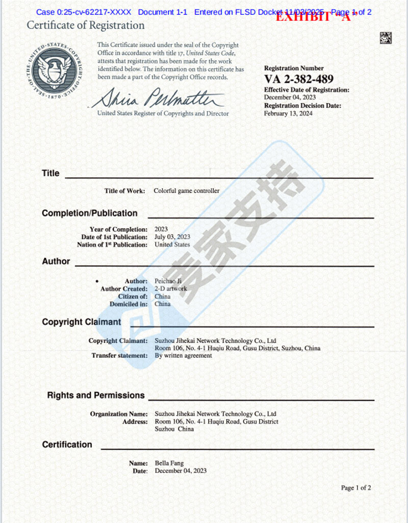 Suzhou Jihekai Network Technology Co., LTD是一家来自中国苏州的跨境电商企业,在亚马逊等跨境电商平台销售毛毯等家居用品。作为一家秉持自主研发与创新企业,Suzhou Jihekai 于2023年7月设计了一款游戏手柄图案,并申请了美国版权认证。该图案融合了游戏手柄、READY GO以及PLAY GAME等元素,充满趣味与活力,一经面世就深受游戏爱好者喜爱!并被广泛用于用于床毯、沙发毯、露营毯、背包等多个生活场景!