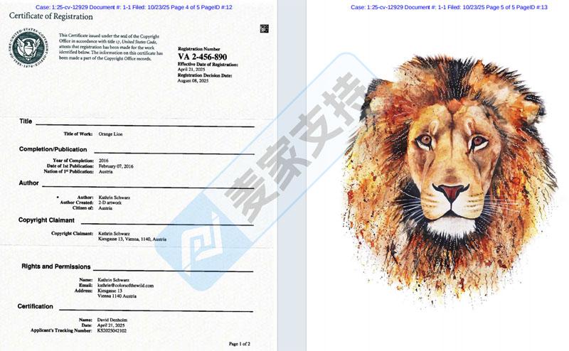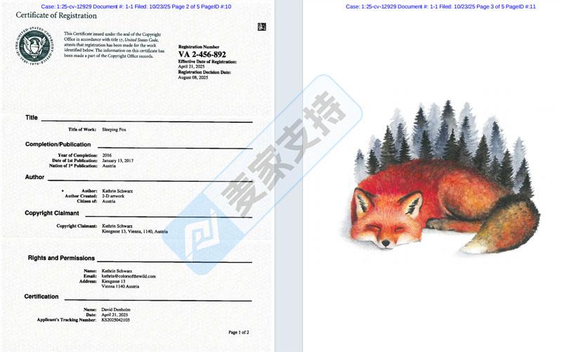 本案是keith律所代理奥地利艺术家Kathrin Schwarz 发起的版权维权案件,原告于2025年4月21日在美国共注册了4个版权作品,本案主要针对VA 2-456-892 和VA 2-456-890两个版权作品展开维权。除此之外,还有VA0002456896和VA0002453259两个作品已获得美国版权认证,跨境卖家注意规避TRO冻结风险!关注我们可跟进案件后续进展!