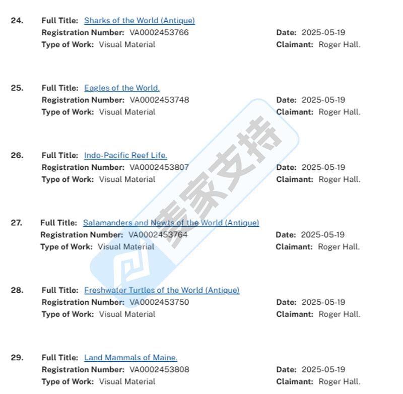 本案是keith律所代理美国资深野生动物插画师Roger Hall发起的版权维权案件,Roger Hall创作了3000多幅作品,仅在2025年5月19日就获得了29个版权认证,而本次案件中仅针对版权号:VA 2-453-771、VA 2-453-772、VA 2-453-775、VA 2-453-766、VA 2-453-763、VA 2-453-813、VA 2-453-761、VA 2-453-756、VA 2-453-743、VA 2-453-759、VA 2-453-806、VA 2-453-758、VA 2-453-747、VA 2-453-745和VA 2-454-563等13个作品发起了维权,麦家支持随手一搜,每个作品在跨境电商平台都有不少店铺在售!保守预计会有上百店铺涉案!且从原告的版权注册量以及受欢迎程度,预计后续将持续维权,全网跨境卖家应尽快对店铺展开全面排查,下架高位产品,做好应对措施!有上架相关产品的卖家也可关注我们,跟进案件后续进展!