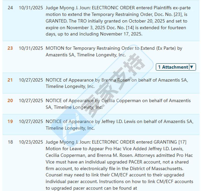 本案是Foley Hoag LLP代理Amazentis SA及其全资子公司 Timeline Longevity, Inc. 在马萨诸塞州地方法院发起的商标维权案件,本案共涉及Amazentis在美国注册的关于MitoPure的三个文字商标,涵盖供人类食用的膳食补充剂以及人类膳食补充剂的特色成分等,以及Urolithin A 发明专利,未经授权使用,则会面临TRO冻结风险!目前该案件已于10月底获批了TRO临时限制令,涉案账户资金已被冻结!已经收到TRO传票的卖家可联系我们获取解决方案!