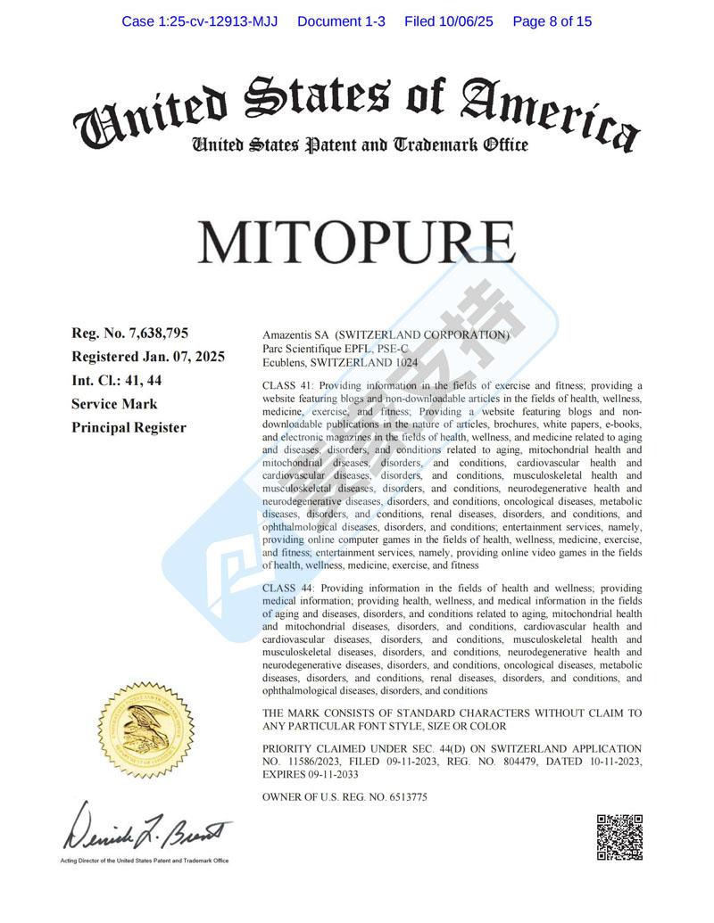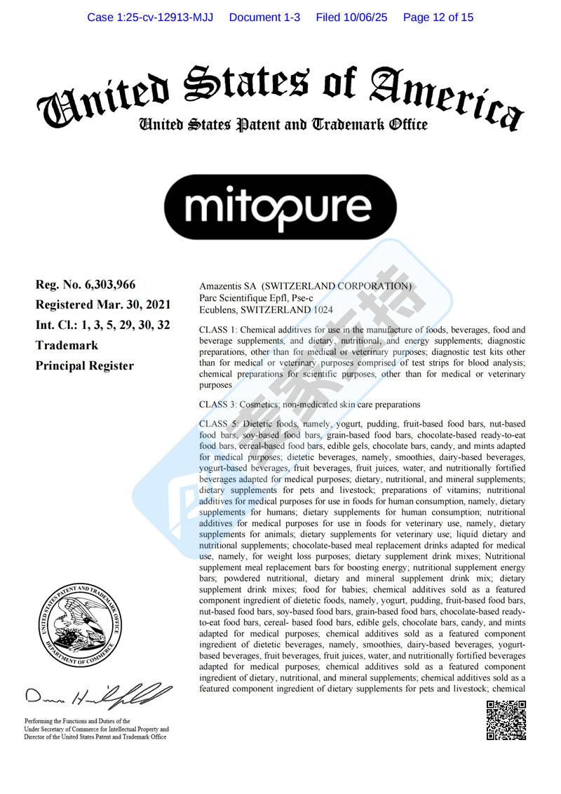 25-cv-12913,MitoPure膳食补剂品牌商标跨境维权,已获批TRO临时限制令