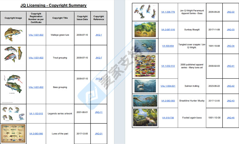 本案是Sriplaw律所代理Jon Q. Wright and JQ Licensing, LLC12月中旬在佐治亚州发起的版权&商标维权案件,截止目前涉案的588个Temu卖家账户已被TRO冻结,需要名单的卖家可以联系我们获取!JQ Licensing, LLC在美国注册有JQ Licensing商标,涵盖第42大类的商业艺术设计服务领域;以及其名下注册的20个鱼类版权图案,未经授权使用则会面临侵权,并被TRO冻结风险,建议跨境卖家在选品时,注意排查规避!
