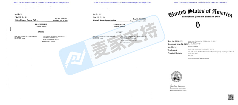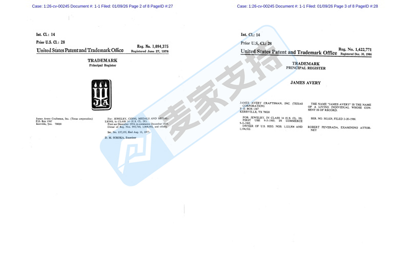 2026-cv-00245,JAMES AVERY热门珠宝商标首立案维权!