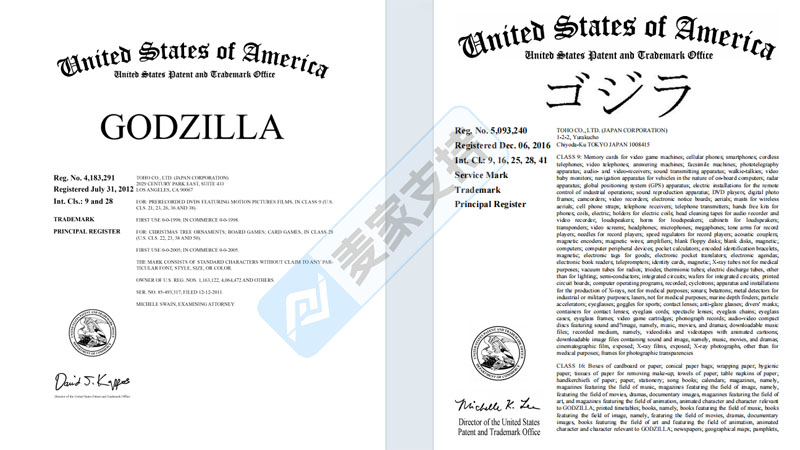 本次Godzilla主要涉及文字商标和视频版权两大方面,商标涵盖广为人知的Godzilla等9个文字商标,包括服装、玩具、游戏产品、漫画书、电影、各类手办玩偶等多个领域。版权则涵盖PA0000785448、PA0000152335、PA0000187943和PA0000152334等20个视频作品,涵盖数百张图片,未经授权在产品中使用Godzilla哥斯拉的视频形象,均会构成侵权!