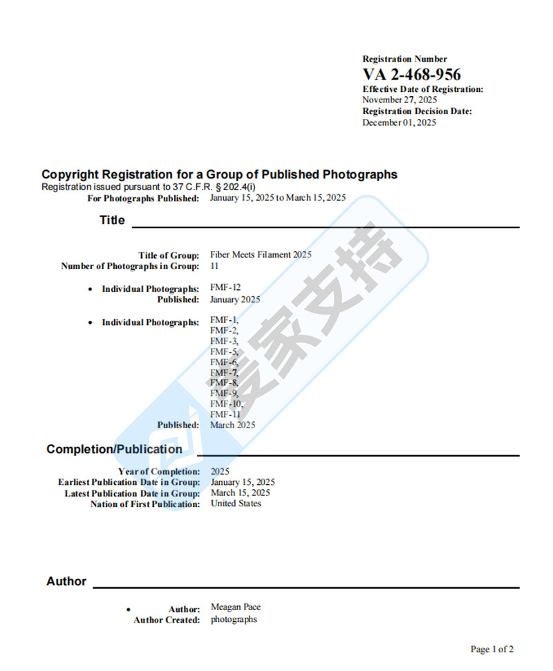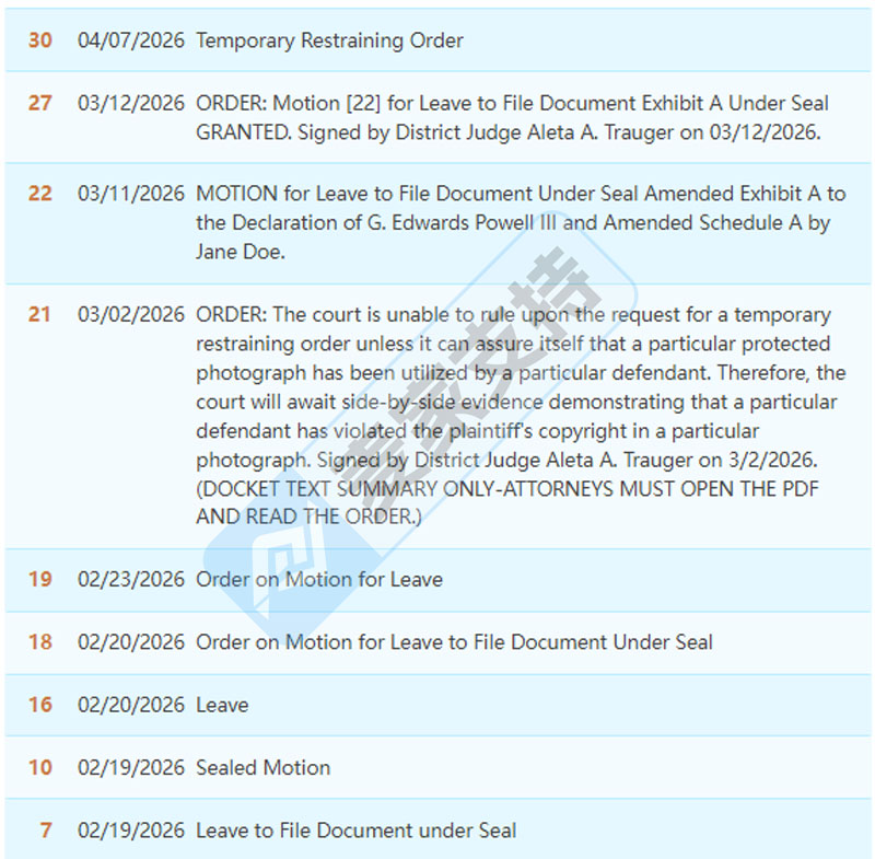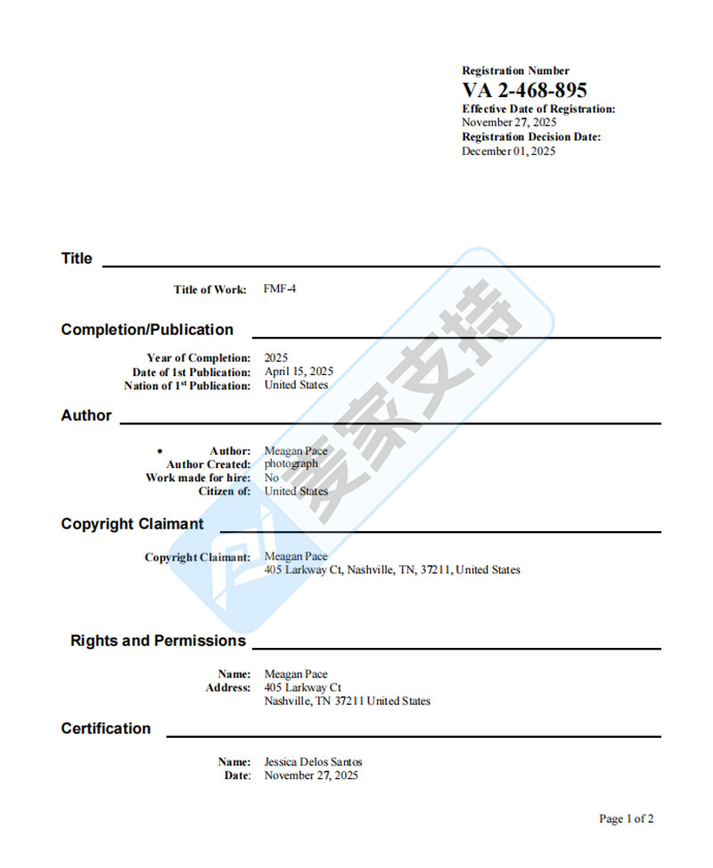 本案是Waddey Acheson LLC代理Meagan Pace在田纳西州西区法院发起的版权维权案件,该案件目前仍处于密封状态,但已于4月7日获取TRO临时限制令,涉案账户资金已被TRO冻结。麦家支持通过原告律所提供的侵权证据锁定该案件涉案版权号为:VA0002468895和VA0002468956,于2025-11-27获得美国版权证书,涵盖FMF-1~FMF-11等11张版权图片,均与一款名为读书计划展示牌的展示图有关,未经授权使用则会面临侵权风险!如果您的账户也不幸因为此案被TRO冻结,可联系我们获取解决方案。
