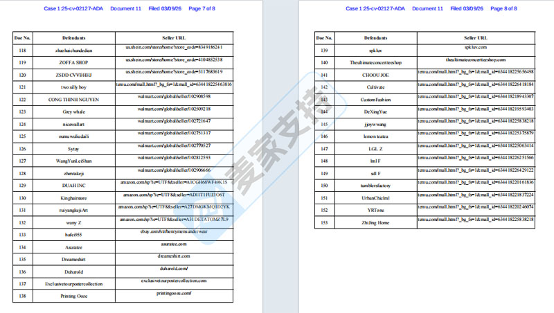 除此之外,原告于2025 年 12 月 23 日在德克萨斯州发起的25 – cv – 02127 案件,已于3月9日获批初步禁令,涉案范围涵盖 amazon、dhgate、ebay、shein、temu 以及 walmart、国际站等热门跨境电商平台,高达153个店铺被卷入其中。目前,该案件仍未申请缺席判决,已被TRO冻结账户资金的卖家们切不可掉以轻心。一旦案件进入缺席判决阶段,账户资金极有可能被直接划扣,届时卖家将面临巨大的经济损失,甚至可能因此陷入经营困境。需要名单的卖家可联系我们进行排查,并出具解决方案!