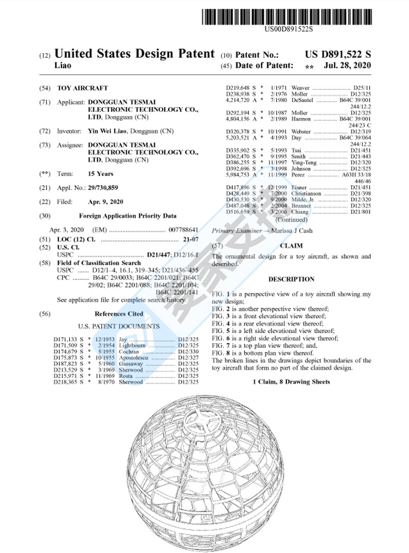 本案是Whitewood律所代理Dongguan Tesimai Electronic Technology Co., Ltd, 在宾夕法尼亚州发起的版权&专利维权案件,针对其专利号为:D891522及美国版权号为:VA 2-376-313、VA 2-376-315和VA 2-376-327的Flying Orb Ball指尖陀螺发起。